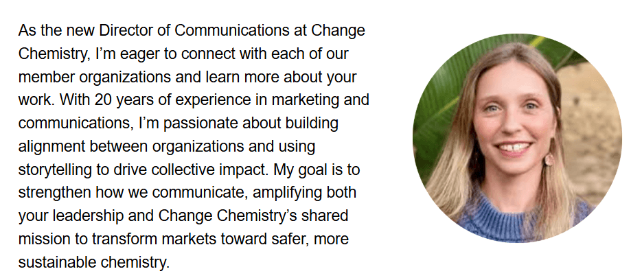 November 2025Meet our new Director of Communications, Carly O'Brien, and learn how she can help communicate your membership. Plus, check out the events Change Chemistry has hosted and joined this fall. August 2025Find out why you should be at the 2025 Innovators Roundtable and learn about other upcoming community events working to drive sustainable solutions. June 2025Executive Director Jason Pearson address our community for the first time, and we share several upcoming events and opportunities. May 2025Jason Pearson joins Change Chemistry as the new Executive Director. Joel Ticker reflects on this transition in a letter to the community. April 2025In our April newsletter, the Change Chemistry team emphasizes our commitment to sustainable chemistry and our members in this time of uncertainty. Plus, we share our 2024 Year in Review. March 2025Hear from Rui Resendes on molecular accounting and learn more about exclusive opportunities for Change Chemistry members. February 2025Announcing that our 2025 Innovators Roundtable will be hosted by Battelle in September, and sharing other events you can find us at this year. January 2025Sharing out goals and new initiatives for 2025, and insights from our conversation with John Warner, co-founder of green chemistry. December 2024Reflecting on our 2024 accomplishments, including the recent Innovators Roundtable. November 2024Sharing our upcoming efforts on scaling sustainable solvents. October 2024Celebrating our members' successes and key collaborations that are driving the transition to safer and more sustainable chemistry. September 2024Read about how we are implementing member's feedback into our 2024 Innovators Roundtable and other initiatives. August 2024Reflecting on the sustainable chemistry policy events Change Chemistry co-hosted last month. July 2024Reflecting on Change Chemistry's recent events and looking forward at opportunities in green and sustainable chemistry. |